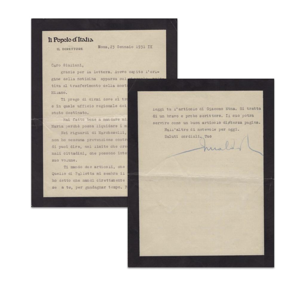 Lettera dattiloscritta con autografo di Arnaldo Mussolini noto giornalista, intellettuale e fratello minore di Benito Mussolini. Laureato in agraria, si dedicò presto all’insegnamento e poi al giornalismo. Dal 1922 fu direttore del quotidiano Il Popolo d’Italia, organo ufficiale del Partito Nazionale Fascista, contribuendo alla costruzione dell’apparato culturale del regime. Meno coinvolto nella politica attiva rispetto al fratello, Arnaldo fu il principale stratega editoriale e ideologico della stampa fascista. Morì improvvisamente a Milano nel 1931, lasciando un vuoto significativo nella struttura mediatica del regime. Lettera su carta intestata "Il Popolo d’Italia – Il Direttore" redatta a Roma, 23 gennaio 1931 (IX). Nel testo, Arnaldo si rivolge al corrispondente Giuliani, comunicando il trasferimento di una mostra di Monza a Milano e successivamente chiede in quale ufficio regionale è stato trasferito Marchiandi. Arnaldo parla anche di un disguido con Marcheselli, "ti ripeto che non ho nessuna prevenzione contro di lui" e gli comunica che gli invierà due articoli da leggere; quello di Pallotta e quello di Giacomo Etna. La firma autografa redatta con matita blu conclude la lettera.