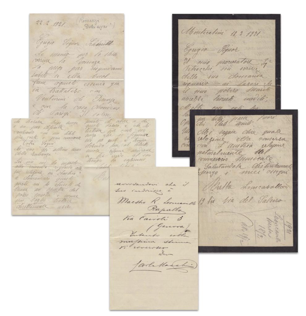Carteggio sulla cessione dei diritti dell’opera “Lasciar amar” e "Ave Maria" di Ruggero Leoncavallo con l'Editore Schmidl. Raro e interessante carteggio inerente alla gestione e cessione dei diritti dell’opera Lasciar amar del compositore Ruggero Leoncavallo, uno dei protagonisti del verismo musicale italiano. Il nucleo è composto da: – Tre lettere interamente autografe di Berthe Leoncavallo, moglie del compositore, datate 1921 e contenenti riferimenti diretti alla gestione dei diritti editoriali; Nelle lettere Berthe elogia i lavori (operette, romanze) del marito, parla dello straordinario successo di "Edipo Re" in America, dell'opera rappresentata con Titta Ruffo a Chicago che ha avuto un successo clamoroso. Successivamente parla delle numerose opere inedite lasciate incompiute e dei rapporti con Venturini di Firenze, con Parigi per "Dolci sogni", con l'Austria, con il procuratore Petrocchi e con Renzo Sonzogno, appena mancato, con cui aveva un rapporto di amicizia stretto. – Una busta autografa anch’essa redatta da Berthe Leoncavallo e indirizzata a Carlo Schmidl Editore, probabile destinatario della trattativa editoriale; – Il contratto datato 1946, redatto in lingua inglese, relativo alla cessione dei diritti dell’opera, che testimonia i rapporti internazionali intessuti per la diffusione delle musiche di Leoncavallo nel dopoguerra; – Un certificato di registrazione dell’opera, rilasciato tra Francia e Austria nel 1913, che attesta la tutela internazionale dei diritti d’autore sin dai primi decenni del Novecento; – Una lettera interamente autografa di Carlo Macchi, storico segretario di Leoncavallo, relativa all’invio di 1000 lire per la gestione del contratto dell’opera Ave Maria, con aggiornamento sul nuovo indirizzo del compositore a Rapallo. Questo carteggio è di straordinaria importanza per lo studio della circolazione editoriale delle opere di Leoncavallo, per il ruolo di Berthe Leoncavallo nella gestione postuma del repertorio del marito, e per i rapporti con case editrici italiane e internazionali. Ruggero Leoncavallo (1857–1919) fu uno dei massimi operisti italiani, celebre in tutto il mondo per Pagliacci, ma autore di un ampio catalogo che spazia tra opera, romanze da salotto, operette e musica sacra. Materiale ideale per collezionisti, studiosi di diritto d’autore e appassionati di storia musicale del primo Novecento.