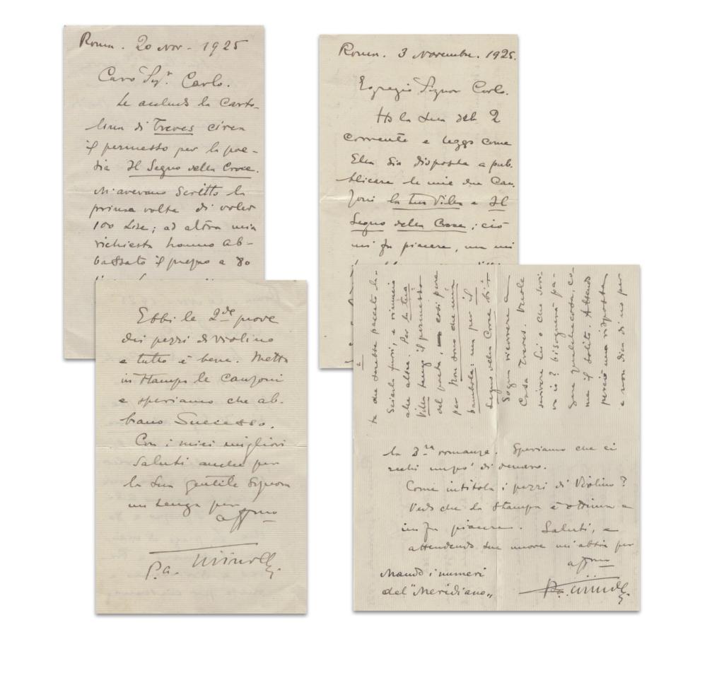 Carteggio autografo di Pier Adolfo Tirindelli celebre compositore, violinista e direttore d’orchestra. Allievo di Antonio Bazzini e amico di Giuseppe Verdi, fu direttore del Conservatorio di Parma e successivamente attivo negli Stati Uniti come docente e musicista. È noto per le sue liriche da camera, melodicamente raffinate, di cui O primavera (su testo di Ada Negri) è l’esempio più celebre. Interessante carteggio composto da due lettere interamente autografe e firmate del compositore Pier Adolfo Tirindelli, indirizzate a Carlo Schmidl, storico editore e promotore musicale triestino. Entrambe le lettere sono redatte a Roma, rispettivamente in data 3 e 20 novembre 1925, e costituiscono una preziosa testimonianza di carattere storico-musicale e contrattuale. Nella prima lettera (3 novembre), Tirindelli si dice lieto per l’imminente pubblicazione di due sue canzoni, Il segno della croce e La tua villa, e manifesta il desiderio che venga pubblicata anche Non sono che una bambola, per la quale ha già ottenuto il permesso del poeta, così come per La tua vita. Specifica tuttavia che, per Il segno della croce, è necessario ottenere il consenso da parte dell’editore Treves. La seconda lettera (20 novembre) conferma l’evoluzione positiva della trattativa: Tirindelli ha ottenuto l’autorizzazione da Treves, e comunica a Schmidl che si sono accordati per un compenso di 80 Lire, da suddividere equamente. La lettera si chiude con un tono fiducioso e incoraggiante: "Stampa le canzoni e speriamo che abbiano successo." Carteggio di valore storico-documentale che illumina il processo di pubblicazione musicale nel primo Novecento, i rapporti tra compositori ed editori e la gestione dei diritti d’autore, con riferimenti a noti editori dell’epoca come Treves. Ideale per collezionisti e studiosi di editoria musicale italiana. Presente anche una busta d'invio anch'essa interamente autografa di Tirindelli.