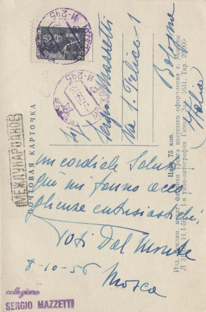 Cartolina interamente autografa e firmata da Toti Dal Monte, celebre soprano italiana, inviata da Mosca l’8 ottobre 1956 al noto collezionista di autografi Sergio Mazzetti di Bologna. Nel testo la cantante invia un cordiale saluto raccontando con entusiasmo la calorosa accoglienza ricevuta: “qui mi fanno accoglienze entusiastiche”. La missiva testimonia non solo il prestigio internazionale della Toti Dal Monte ma anche il suo rapporto epistolare con importanti appassionati e collezionisti italiani.