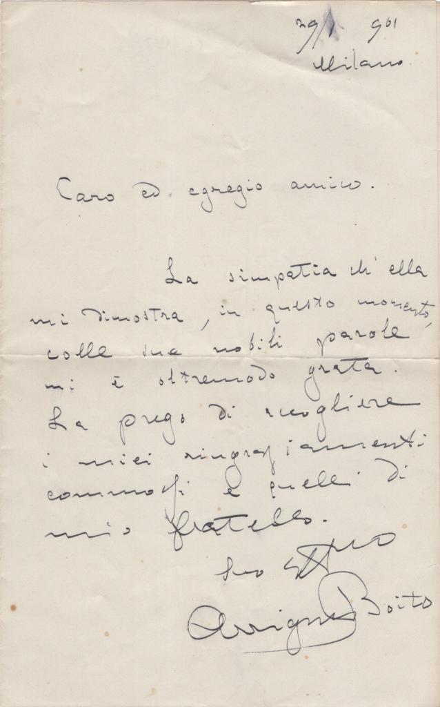 Splendida lettera interamente autografa e firmata di Arrigo Boito, inviata da Milano il 29 gennaio 1901 ad un amico non identificato. Nel testo il celebre librettista e compositore ringrazia con emozione per la simpatia e la vicinanza dimostratagli in un momento di grande dolore, esprimendo non solo la propria gratitudine ma anche quella del fratello Camillo. Il documento acquista particolare valore storico poiché redatto nei giorni immediatamente successivi alla morte di Giuseppe Verdi, evento che colpì profondamente Boito, suo amico e collaboratore. Una testimonianza intima e toccante, che unisce storia musicale e memoria personale.