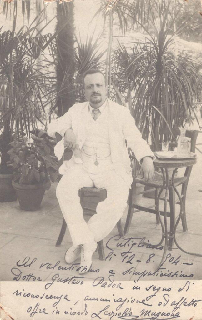 Cartolina con dedica interamente autografa e firmata di Leopoldo Mugnone, fu uno dei più importanti direttori d’orchestra italiani. Celebre interprete di Verdi e Mascagni, diresse la prima assoluta di Cavalleria rusticana nel 1890. Dedica interamente autografa e firmata di Leopoldo Mugnone, redatta a Cutigliano il 12 agosto 1904. La cartolina è indirizzata al Dottor Gustavo Padoa, a cui Mugnone rivolge parole sentite di riconoscenza, ammirazione e affetto. La cartolina, che ritrae Mugnone seduto con indosso abiti chiari, rappresenta una preziosa testimonianza dei rapporti personali e professionali del Maestro, protagonista indiscusso della scena musicale italiana ed europea tra XIX e XX secolo.