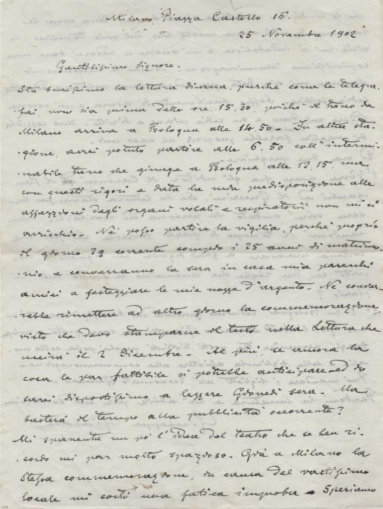 Lettera interamente autografa e firmata di Giuseppe Giacosa celebre drammaturgo, poeta e librettista. Insieme a Luigi Illica scrisse i libretti di celebri opere di Giacomo Puccini, tra cui La Bohème, Tosca e Madama Butterfly, capisaldi del melodramma italiano. Lettera redatta a Milano (Piazza Castello n° 16) il 25 Novembre 1902, con dettagli personali e riflessioni legate al suo lavoro teatrale. Nelle due fitte pagine Giacosa tratta impegni personali e artistici: indica la data del 29 novembre come anniversario di matrimonio (nozze d'argento) e invita l’interlocutore a partecipare; accenna alla stesura e lettura pubblica di una commemorazione e si sofferma sulle difficoltà organizzative e sugli impegni connessi. Giacosa conclude la lettera con due richieste pratiche, relative a incontri con editori e contatti bolognesi, ed esprime il desiderio di avere tra gli uditori Giosuè Carducci, Guerrini e l’avvocato Severino Gianotti con la moglie e la figlia, pregando il destinatario di inviare loro un biglietto d’invito per la commemorazione. Presente nel lotto anche una cartolina originale dell’epoca che ritrae Giacosa.