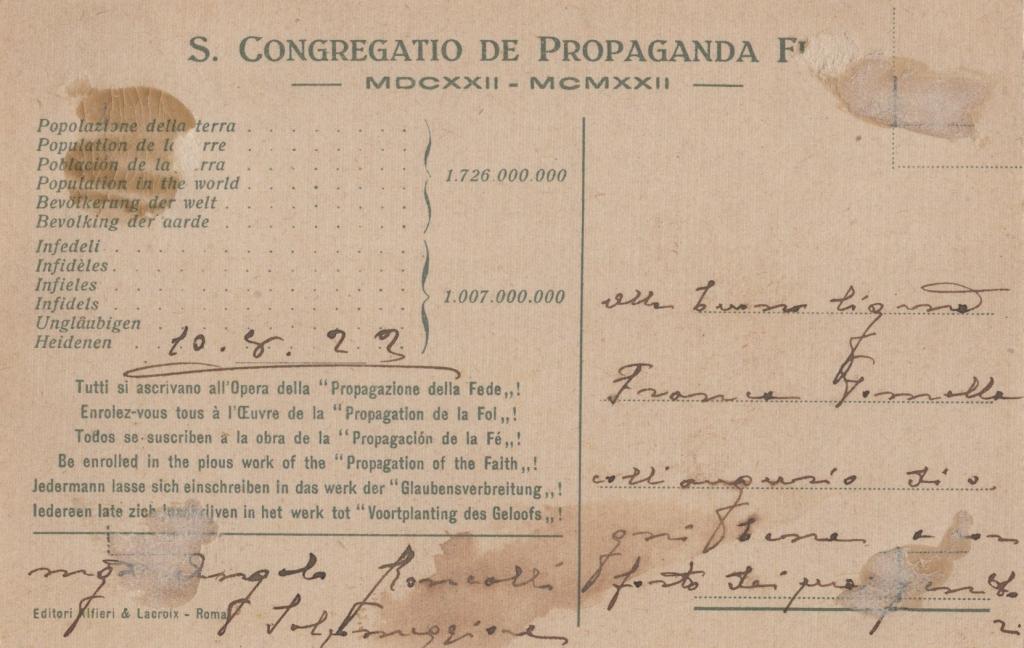 Interessante cartolina interamente autografa e firmata da Angelo Giuseppe Roncalli, fu eletto Papa nel 1958 con il nome di Giovanni XXIII. Ricordato come il “Papa buono”, indisse il Concilio Vaticano II, segnando una svolta nella storia della Chiesa cattolica. Cartolina della S. Congregatio de Propaganda Fide redatta a Salsomaggiore il 10 Giugno 1923. La cartolina destinata alla signora Franca Formella, reca un affettuoso augurio di ogni bene, espresso con la semplicità e la cordialità che avrebbero contraddistinto tutta la vita del pontefice. Il documento, scritto in un periodo precedente ai grandi incarichi diplomatici e pastorali che lo avrebbero portato al soglio pontificio, costituisce una preziosa testimonianza privata della sua personalità. Nel 1921 Roncalli viene nominato presidente del Consiglio Centrale della Pontificia Opera per la Propagazione della Fede. Benedetto XV chiamò Roncalli a Roma per guidare la Pontificia Opera della Propagazione della Fede, posta sotto la diretta competenza della Congregazione di Propaganda Fide. Qui Roncalli maturò una profonda conoscenza del mondo missionario, coordinando le attività di sostegno alle missioni cattoliche nel mondo.
