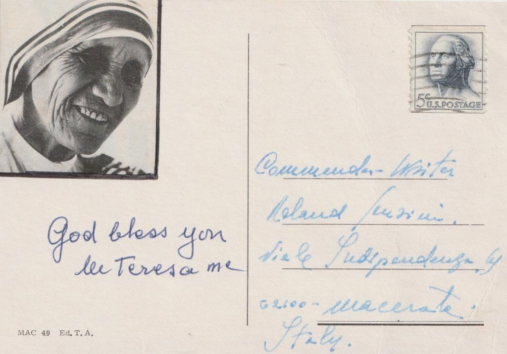 Cartolina con autografo e saluti manoscritti di Santa Madre Teresa di Calcutta nata Anjeze Gonxhe Bojaxhiu, fu una delle figure religiose più influenti del XX secolo. Entrata giovanissima nelle Suore di Loreto, partì come missionaria per l’India, dove maturò la vocazione di dedicarsi ai più poveri tra i poveri. Nel 1950 fondò a Calcutta la Congregazione delle Missionarie della Carità, dedita all’assistenza di ammalati, emarginati e moribondi. La sua opera si diffuse rapidamente in tutto il mondo, diventando simbolo universale di carità e compassione. Ricevette il Premio Nobel per la Pace nel 1979 e numerosi riconoscimenti internazionali. Beatificata da Giovanni Paolo II nel 2003, è stata proclamata santa da Papa Francesco il 4 settembre 2016. La cartolina, indirizzata a Roland Sensini di Macerata, reca saluti personali e la firma della fondatrice delle Missionarie della Carità, nota per la sua vita interamente dedicata ai poveri, ai malati e agli ultimi. Un documento che unisce la dimensione intima del messaggio epistolare alla grandezza universale della sua figura, oggi venerata come Santa. Sopra alla nota autografa è stata applicata una piccola fotografia che ritrae la Santa.