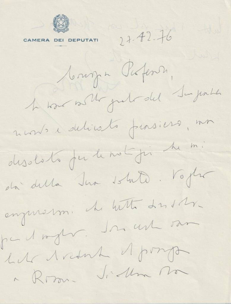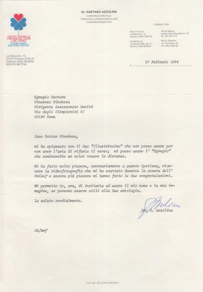 Lettera dattiloscritta con autografo di Gaetano Azzolina celebre cardiochirurgo di fama internazionale e politico italiano, fu deputato alla Camera e tra i pionieri della cardiochirurgia in Italia, autore di numerosi interventi innovativi. Lettera su carta intestata del Centro Toscano di Chirurgia del Cuore e Torace, datata 27 febbraio 1984 ed indirizzata al Dott. Vincenzo Pinchera, dirigente dell’Assessorato Sanità a Roma. Nel testo, Azzolina esprime il suo imbarazzo per i titoli troppo solenni utilizzati dal destinatario, preferendo un tono più cordiale. Si dice lieto per la videofotografia scattata durante una serata UNICEF e ancor più per le congratulazioni ricevute. Conclude invitando Pinchera a utilizzare il suo nome e la sua immagine, se possono esserle utili. Presente la busta d'invio. Condizioni: presenti alcuni difetti riportati a seguito dal distaccamento del foglio da un supporto cartaceo.