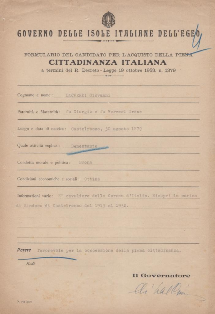 Straordinario documento ufficiale del Governo delle Isole Italiane dell’Egeo, redatto a Rodi e firmato dal governatore Cesare Maria De Vecchi. Il formulario concede la piena cittadinanza italiana a Giovanni Lacherdi (Ioannis Lakerdis), nato a Castelrosso il 30 agosto 1879, di professione benestante.