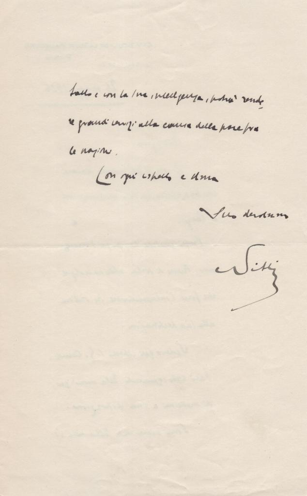 Lettera interamente autografa e firmata di Francesco Saverio Nitti noto economista e politico liberale, fu Presidente del Consiglio dei Ministri tra 1919 e 1920. Strenuo oppositore del fascismo, visse a lungo in esilio tra Francia e Svizzera, tornando in Italia solo dopo il 1943. Partecipò all’Assemblea Costituente e fu senatore della Repubblica.