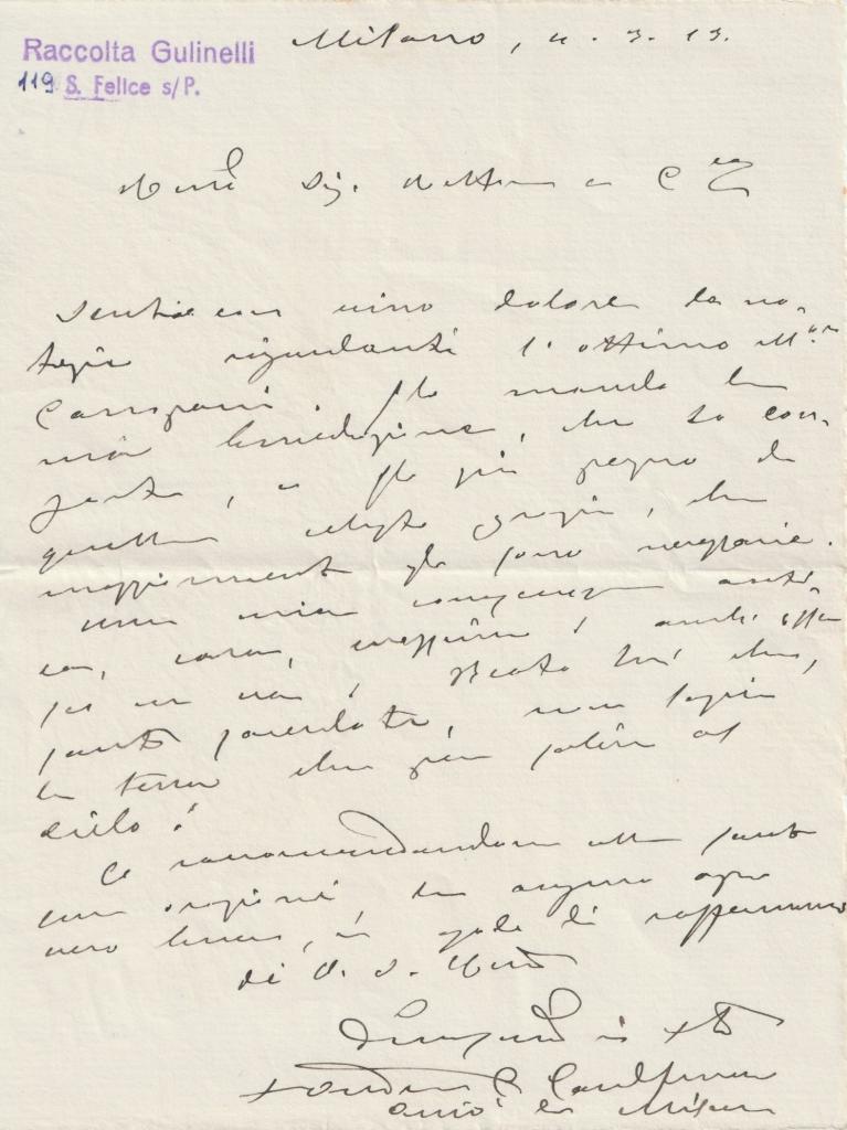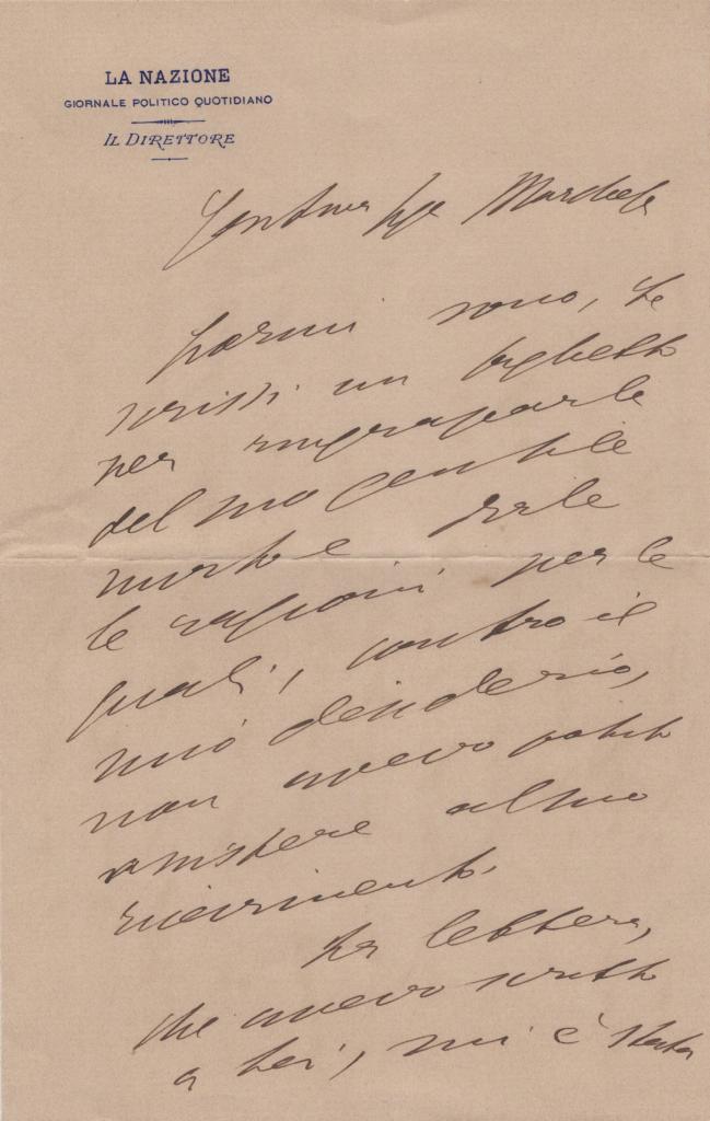 Lettera interamente autografa di Giulio Piccini, noto con lo pseudonimo di Jarro, scrittore, critico e giornalista, collaborò e diresse La Nazione ed è ricordato per i suoi romanzi d’inchiesta e per la diffusione della letteratura italiana all’estero. La missiva, redatta su carta intestata de La Nazione, è indirizzata a un marchese non identificato e contiene considerazioni su notizie provenienti da Napoli, con riferimenti a corrispondenze e fatti di cronaca. La lettera, con il suo tono vivace e diretto, riflette il suo stile di scrittura e il ruolo di mediatore culturale che lo rese noto come una delle voci critiche più originali del giornalismo letterario italiano.