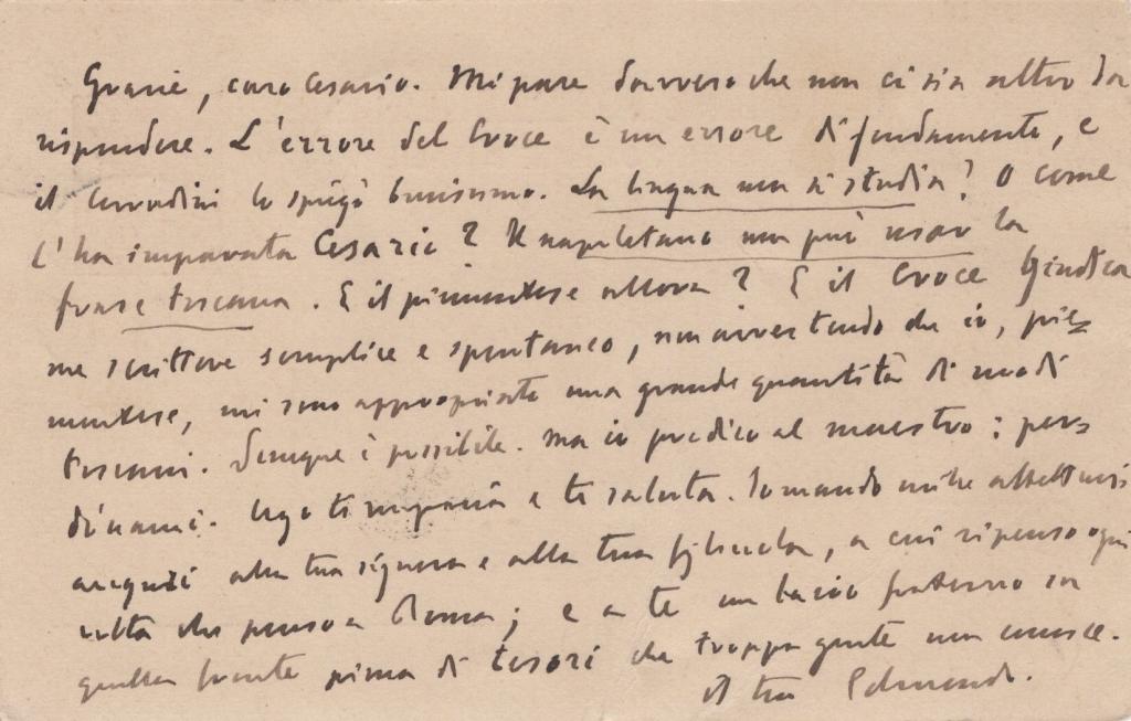 Interessantissima cartolina datata 19 luglio 1905 e indirizzata a Cesario Testa a Roma. La missiva nasce come reazione alla durissima recensione di Benedetto Croce contro il suo libro L’idioma gentile, pubblicata il 7 luglio dello stesso anno. Con tono fermo ma sereno, De Amicis replica ironicamente al filosofo: “la lingua non si studia?”, rivendicando il valore educativo e civile della sua opera. Aggiunge riflessioni sul proprio stile semplice e spontaneo, arrivando a scrivere: “… ma io predico il maestro…”. Documento di grande rilevanza letteraria e storica, testimonianza diretta della celebre polemica che oppose la prosa etico-pedagogica di De Amicis al rigore estetico di Croce.