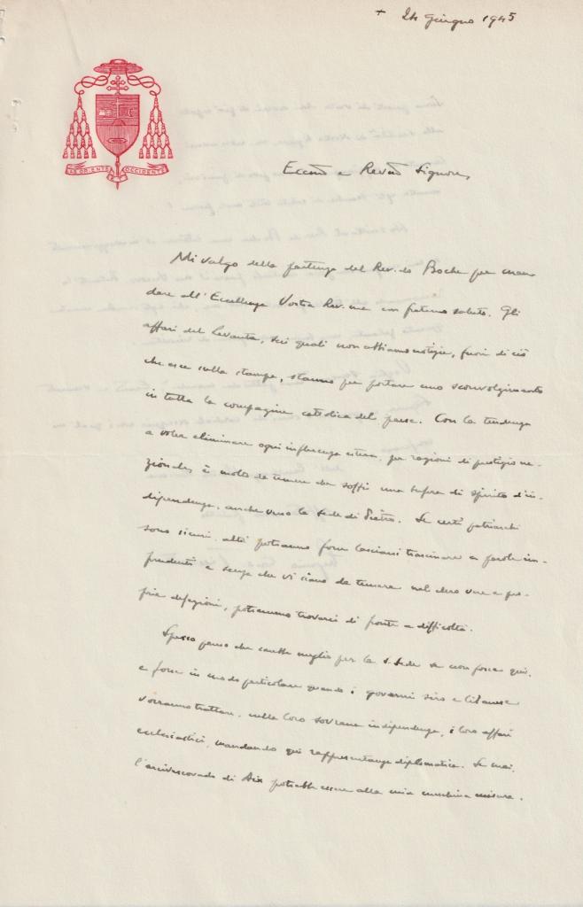 Rarissima lettera redatta il 24 giugno 1945. Nella missiva il porporato affronta alcuni delicati affari del Levante, definiti “notizie sconvolgenti” per l’intera compagnia cattolica del Paese, riflesso delle complesse dinamiche religiose e politiche dell’area mediorientale. Tisserant cita inoltre il reverendo Roche, citando una lettera di incoraggiamento inviata. Documento di notevole interesse, che testimonia l’attenzione del cardinale per le Chiese orientali e la sua fitta rete di rapporti internazionali, in un momento cruciale del dopoguerra.