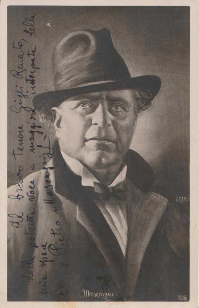 Interessante cartolina indirizzata al tenore Renato Gigli. Mascagni rivolge una dedica di apprezzamento "Al bravo tenore Gigli Renato, dalla potente voce e maggiore interprete delle mie opere”, sottolineando la stima e la simpatia verso l’artista. Documento che unisce due protagonisti del panorama lirico italiano del Novecento: Mascagni, autore immortale di Cavalleria Rusticana, e Renato Gigli, apprezzato interprete della tradizione vocale italiana. Un cimelio raro, che riflette i rapporti di amicizia e riconoscenza tra compositori e cantanti della grande stagione operistica italiana. Presenti alcuni segni di distaccamento della cartolina da nastro adesivo.