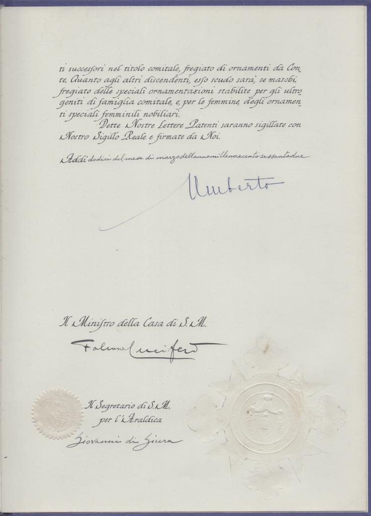 Prestigioso decreto di nobiltà, firmato da Umberto II di Savoia, ultimo Re d’Italia, redatto il 12 marzo 1972. Il documento concede al sig. Guglielmo Bolla il titolo nobiliare di Conte, riportando con grande raffinatezza anche il disegno araldico a colori dello stemma della famiglia Bolla su pergamena protetto da carta velina. Il decreto, rilegato all'interno di un'elegante cartellina blu in tela con stemma sabaudo al centro, reca le controfirme di Lucifero Falcone e di Giovanni di Giura, in qualità di Segretario di S.M. per l’Araldica, oltre al sigillo ufficiale in ottime condizioni di conservazione.