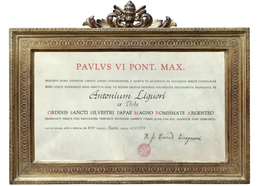 Documento a nome di Paolo VI (Giovanni Battista Montini), Papa dal 1963 al 1978, con firma del Cardinale Amleto Giovanni Cicognani, importante figura della Curia romana, Segretario del Santo Uffizio e collaboratore chiave di Papa Paolo VI. Il testo, redatto in forma solenne, conferma il conferimento della Grande Medaglia d'Argento del Papa ad Antonio Liguori, come segno di riconoscimento per il suo impegno e il suo contributo alla salute e alla crescita della Chiesa cattolica. Il conferimento, simbolo di prestigio ecclesiastico, viene accompagnato dai privilegi connessi a questa alta dignità. Documento di straordinario valore storico e religioso, che testimonia l’operato del Papa Paolo VI nel riconoscere e onorare figure di spicco nella Chiesa. Documento redatto su pergamena con timbro del Segretario di Stato Papale ed incorniciato in una bellissima cornice con motivi floreali.