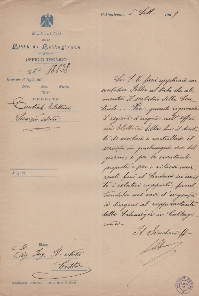 Lettera con autografo di Don Luigi Sturzo, redatta a Caltagirone il 5 settembre 1909, su carta intestata del Municipio della città di Caltagirone e indirizzata all'Ing. Nato. Nella missiva, Don Sturzo, allora sindaco della città, risponde a una richiesta riguardo la centrale elettrica e il servizio idrico. Con precisione, il sindaco discute l’applicazione di un contatore per il sistema idrico e la possibilità di migliorare il servizio. Don Sturzo si mostra disponibile a visitare e controllare personalmente i lavori, oltre a offrire la sua disponibilità per eventuali proposte. Questa lettera rappresenta un’importante testimonianza storica di uno degli uomini più significativi della storia italiana del Novecento. Timbro di provenienza di collezione privata.