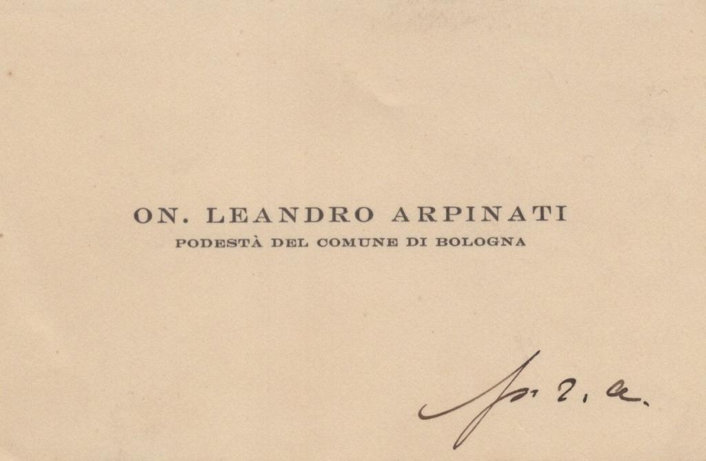 Raro biglietto da visita dell'On. Leandro Arpinati, Podestà del Comune di Bologna, con piccola nota autografa "p.r.a." (per ricordo affettuoso) redatta in calce. La nota aggiunta di suo pugno arricchisce l’esemplare, conferendogli unicità e valore storico-documentario. Leandro Arpinati (1892-1945) fu politico e dirigente sportivo italiano. Figura di rilievo del fascismo, Podestà di Bologna e presidente del CONI, ebbe un ruolo di primo piano nella vita politica e sportiva italiana dell’epoca.