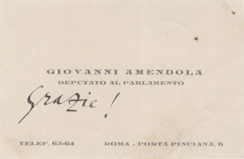 Biglietto da visita di Giovanni Amendola noto politico, giornalista e intellettuale, fu tra i principali oppositori del regime fascista. Deputato liberale, fondò il quotidiano Il Mondo e subì violente aggressioni squadristiche che ne compromisero la salute. Biglietto con un breve appunto autografo (senza firma) di Amendola con la parola “Grazie!”. L’uso dei biglietti da visita con minute manoscritte era consuetudine nel mondo politico e culturale del primo Novecento: una forma rapida ma personale di comunicazione che trasformava il supporto tipografico in un documento unico e carico di valore storico.