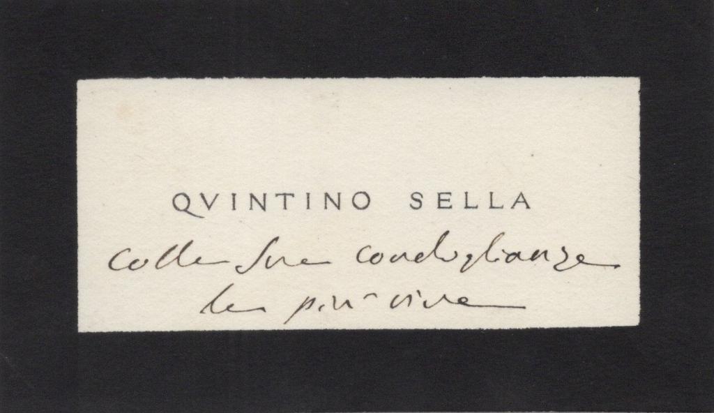 Biglietto da visita, listato a lutto, di Quintino Sella noto ingegnere, scienziato e politico, fu più volte Ministro delle Finanze del Regno d’Italia e promotore di importanti riforme economiche. Fondatore del Club Alpino Italiano, unì l’impegno scientifico alla passione civile. Presente nel biglietto una nota autografa (senza firma) vergata da Sella con la frase “colle sue condoglianze le più vive”. I biglietti listati a lutto erano usati per esprimere vicinanza in occasione di lutti familiari o eventi tragici, e risultano particolarmente significativi se accompagnati da minute manoscritte.