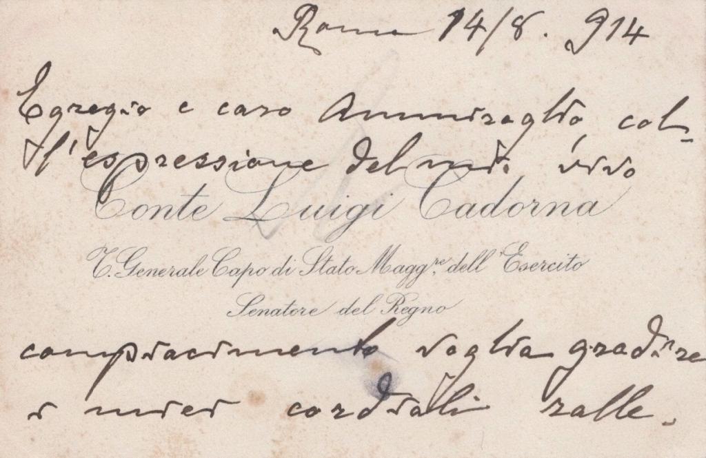 Raro biglietto da visita intestato al generale Luigi Cadorna celebre generale e Capo di Stato Maggiore dell’Esercito Italiano durante la Prima guerra mondiale, protagonista delle prime campagne belliche fino a Caporetto. Sul biglietto è riportata una lunga nota autografa firmata e datata Roma, 14 agosto 1914. Nel testo Cadorna si rivolge a un ammiraglio, esprimendo “coll’espressione del mio vivo compiacimento” e inviando “i miei cordiali rallegramenti”. L’esemplare testimonia un momento cruciale della carriera del generale, nominato Capo di Stato Maggiore dell’Esercito proprio nel luglio 1914, all’indomani dello scoppio della Prima guerra mondiale. I biglietti da visita arricchiti da annotazioni di questa ampiezza e firmati risultano estremamente rari e di alto valore storico.