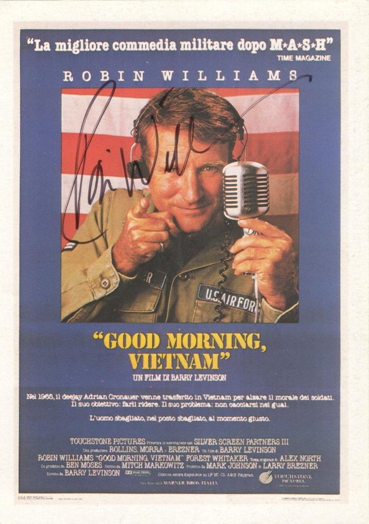 Cartolina promozionale del film cult Good Morning, Vietnam (1988), impreziosita dall’autografo di Robin Williams celebre attore e comico statunitense, vincitore di un Oscar per Will Hunting e protagonista di film iconici come Mrs. Doubtfire e L’Attimo Fuggente. L’attore, protagonista indimenticabile nella parte del sergente radiofonico Adrian Cronauer, ottenne una nomination all’Oscar per questa interpretazione che unisce comicità travolgente e drammaticità legata al conflitto vietnamita.