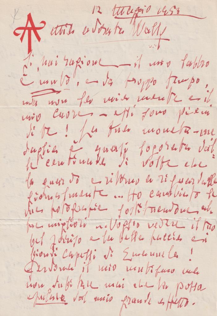 Straordinaria e intensa lettera interamente autografa (senza firma) di Arturo Toscanini redatta il 12 maggio 1953 e indirizzata a Wally. Questo documento, dal contenuto umano e intimo di rara profondità, riflette il tormento e la stanchezza interiore del grande direttore all’età di 86 anni, in un momento in cui la sua leggenda era già consolidata ma la sua vita personale segnata da fragilità e consapevolezza del tempo che passa. L’incipit è dolce e personale: Toscanini si scusa per il silenzio con le parole “il mio labbro muto” e confessa la gioia nell’attesa di rivedere “il suo bel sorriso”. Subito dopo, però, il tono si fa drammatico, quasi disperato. Scrive della fatica e dell’ansia che lo hanno accompagnato nello studio e nella direzione della Missa Solemnis di Beethoven, ricordando l’ultima volta che la diresse nel 1940: “Ho cercato di migliorarmi… spero di esserci riuscito – dico spero, ma non sono sicuro”. Il cuore della lettera risiede nella sua confessione più dura: “Speravo di chiudere… per finirla una buona volta perché non ne posso più di essere Arturo Toscanini – oramai mi annoio di udire il mio nome – sono già molti anni, troppi, che lo si sente e vorrei riposarmi per quel poco tempo che mi resta di vivere e godere una morte tranquilla”. Parole che testimoniano un desiderio di pace contrapposto all’ineluttabile destino di continuare a lavorare fino all’ultimo respiro. Toscanini descrive il cambiamento fisico e la percezione del tempo che avanza: “Venti anni fa dopo una prova o un concerto veniva il medico a farmi un’iniezione: oggi viene a guardare se la pressione è sempre buona… mi sento stanco… la mia memoria non è più quella di prima”. Nonostante ciò, riconosce la disciplina e l’impegno che lo hanno sempre sostenuto: “Dicono tutti cominciando dall'orchestra che dirigo -meglio di prima- e non posso davvero negarlo, ma io ho continuato sempre a studiare e non ho mai creduto di poter fare senza e fino all'ultimo giorno non mi vedranno mai rammollito!”. Il finale è di struggente intensità, con una confessione che mostra la sua insonnia e il tormento interiore: “Ho già preparato i miei programmi e già cominciato a studiare ma non sono felice, non so perché, ma mi tormento, non dormo bene, ma bensì male, soprattutto da sogni continui e paurosi”. Una frase che rivela tutta la fragilità di un uomo che, pur al culmine della gloria, si sentiva prigioniero del proprio destino. Un documento commovente che mostra Toscanini, genio assoluto della direzione orchestrale, segnato indelebilmente da fatica, insicurezze e desiderio di riposo.