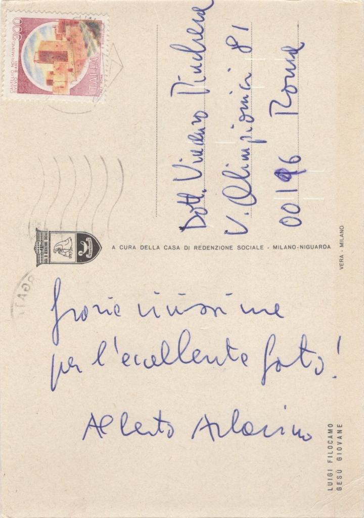 Cartolina interamente autografa e firmata di Alberto Arbasino celebre scrittore, saggista, critico e intellettuale milanese, fu esponente del Gruppo 63 e autore di opere memorabili come Fratelli d’Italia (1963) e Super Eliogabalus (1969). Deputato nella IX legislatura (1983-1987), contribuì in modo originale al panorama culturale italiano contemporaneo. Cartolina indirizzata al Dott. Pinchera di Roma, Arbasino ringrazia il destinatario per "l'eccellente foto". La cartolina riporta sul fronte un dipinto di Luigi Filocamo dal titolo: "Gesù Giovane".