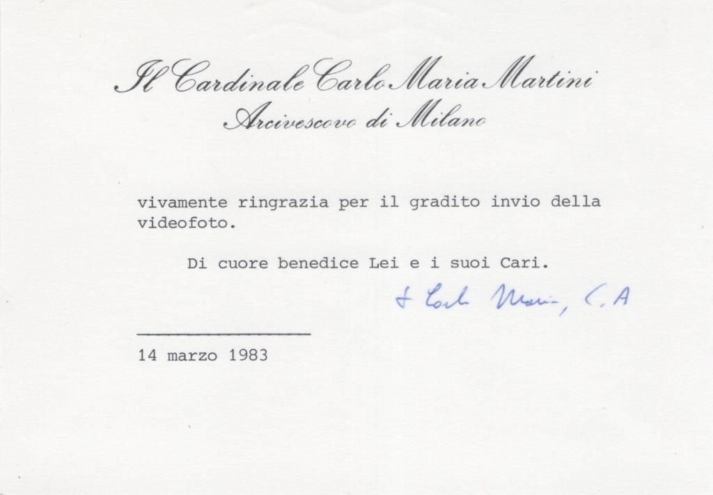 Biglietto su carta intestata con autografo di Carlo Maria Martini, gesuita e biblista, fu arcivescovo di Milano dal 1979 al 2002 e cardinale. Considerato tra i più autorevoli intellettuali cattolici del Novecento, ebbe grande influenza nel dibattito religioso e culturale europeo. Fu soprannominato "cardinale del dialogo". Biglietto con autografo di Carlo Maria Martini, datato 14 marzo 1983, contenente un testo di ringraziamento per l’invio della videofoto e un pensiero di benedizione rivolto al destinatario e ai suoi cari. Raro documento redatto dal neo cardinale arcivescovo di Milano. Presente anche la busta d'invio anch'essa su carta intestata con l'indirizzo del destinatario. Condizioni: il biglietto e la busta riportano dei segni di un precedente distaccamento da un supporto cartaceo.
