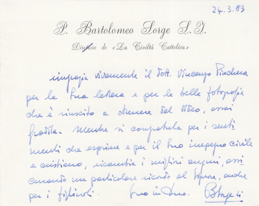Biglietto interamente autografo e firmato di Padre Bartolomeo Sorge S.I., gesuita, teologo e giornalista, fu direttore de La Civiltà Cattolica e di Aggiornamenti Sociali. Figura di rilievo del cattolicesimo italiano, unì l’impegno culturale a quello pastorale. Biglietto datato 24 marzo 1983, in cui il gesuita ringrazia il destinatario per il gradito invio di alcune fotografie estrapolate da un video. La missiva, redatta con tono cordiale e personale, si chiude con un sincero messaggio di stima per l'impegno civile e cristiano e con un augurio rivolto al destinatario e ai suoi figli. Presente la busta d'invio su carta intestata de "La Civiltà Cattolica" con destinatario.
