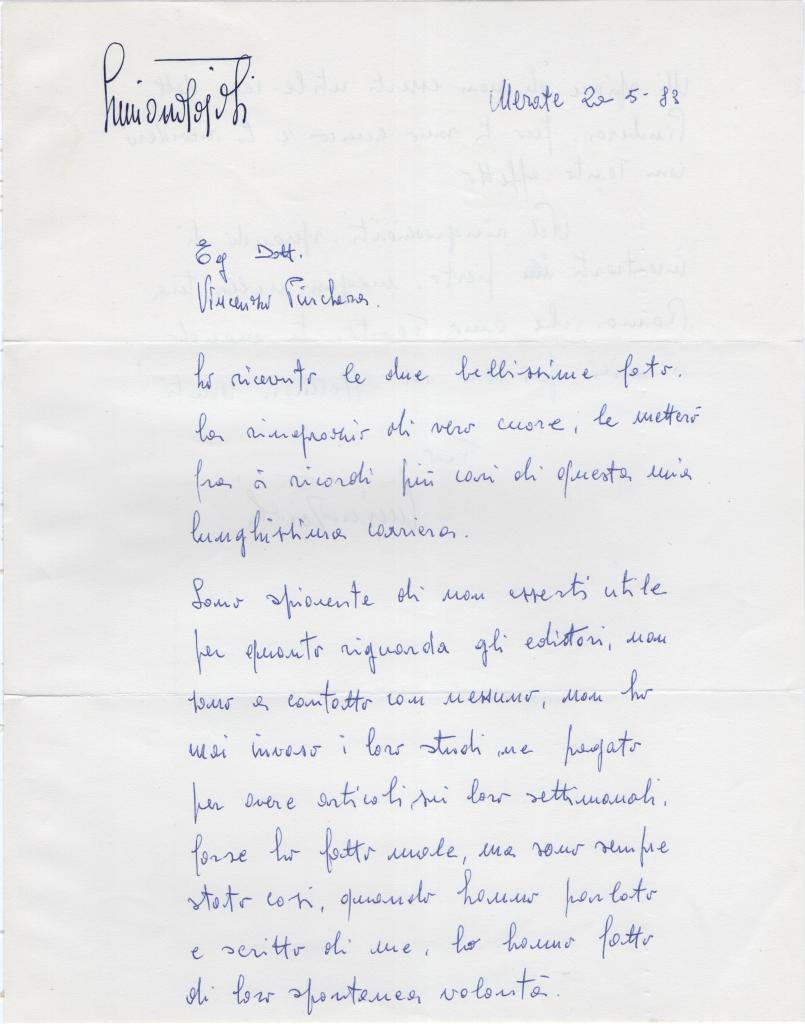 Lettera interamente autografa e firmata di Luciano Tajoli, cantante e attore milanese, fu tra i più popolari interpreti italiani degli anni ’50 e ’60. Vinse il Festival di Sanremo nel 1961 con Al di là e incise numerosi successi rimasti nella memoria collettiva. Lettera redatta su carta intestata personale da Merate il 20 maggio 1983. Nel testo il celebre cantante ringrazia il destinatario per le bellissime fotografie ricevute, assicurandogli che le conserverà tra i ricordi più cari della sua lunghissima carriera. Prosegue confidando di non avere agganci nel mondo editoriale e sottolinea come gli articoli e i commenti su di lui siano sempre nati da volontà spontanee: “quando hanno parlato e scritto di me, lo hanno fatto di loro spontanea volontà”. La lettera si chiude con l’augurio sincero di poterlo incontrare a Roma. Presente la busta d'invio anch'essa autografa e su carta intestata del Tajoli. Condizioni: presenti dei segni di distaccamento da un supporto cartaceo.