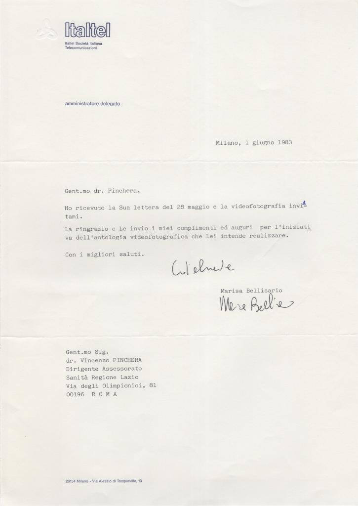 Lettera dattiloscritta con saluti manoscritti e autografo di Marisa Bellisario, manager piemontese, fu la prima donna a ricoprire il ruolo di amministratore delegato in una grande azienda italiana. Guidò Italtel negli anni ’80, diventando simbolo di innovazione e leadership femminile. Lettera su carta intestata Italtel – Società Italiana Telecomunicazioni redatta a Milano, il 1° giugno 1983 e indirizzata al dott. Vincenzo Pinchera. La missiva conferma la ricezione della sua lettera del 28 maggio e della videofotografia allegata. Bellisario esprime i suoi ringraziamenti, complimenti e auguri per l’iniziativa dell’antologia videofotografica che Pinchera intendeva realizzare, concludendo con una formula di cortesia. Presente la busta d'invio. Condizioni: il biglietto e la busta riportano dei segni di un precedente distaccamento da un supporto cartaceo.