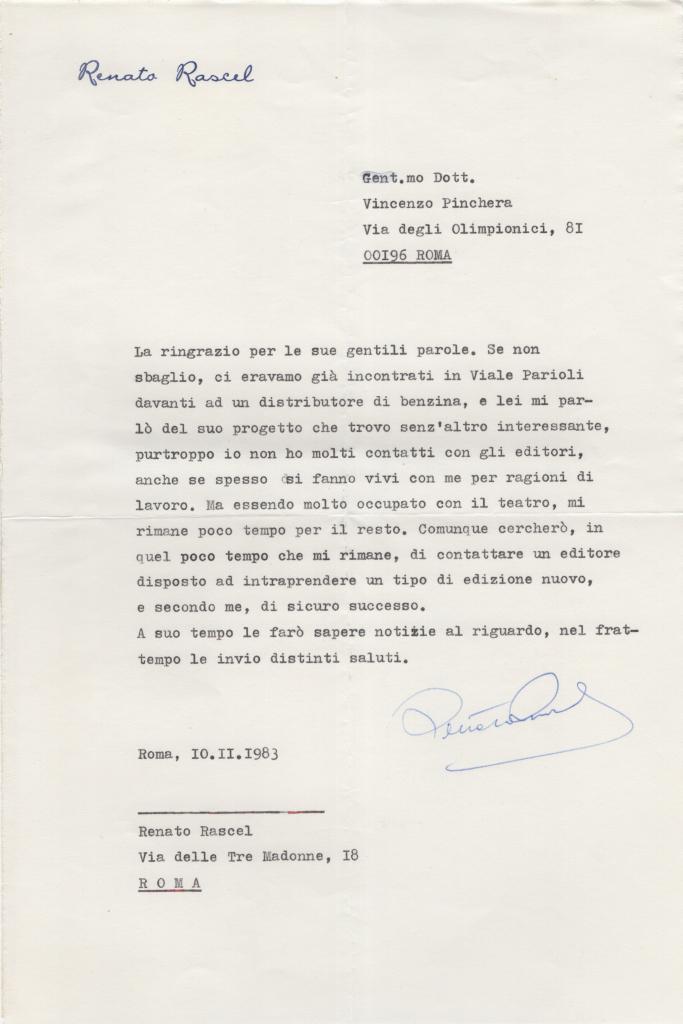 Lettera dattiloscritta con autografo di Renato Rascel, , nome d’arte di Renato Ranucci, fu attore, cantante e comico romano. Icona del teatro e del cinema italiano, portò al successo brani celebri come Arrivederci Roma e partecipò all’Eurovision Song Contest del 1960. Lettera su carta intestata personale datata Roma, 10 novembre 1953 e indirizzata al dott. Vincenzo Pinchera. L’artista esprime gratitudine per le gentili parole ricevute e sottolinea il valore della stima personale. Rascel confida le difficoltà e i sacrifici della carriera teatrale, parlando di impegno costante e di un lavoro svolto senza appoggi esterni: “ho passato molto tempo nel teatro, consumando serenamente la mia giovinezza, ma senza raccomandazioni né protezioni”. Conclude inviando i più cordiali saluti e auguri. Presente anche la busta d'invio anch'essa su carta intestata con l'indirizzo del destinatario. Condizioni: la lettera e la busta riportano dei segni di un precedente distaccamento da un supporto cartaceo.