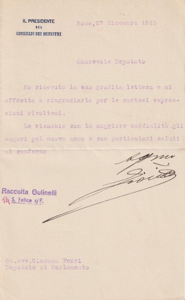 Lettera dattiloscritta con autografo di Giovanni Giolitti noto statista e più volte Presidente del Consiglio del Regno d’Italia tra il 1892 e il 1921. Protagonista dell’età liberale, promosse riforme sociali ed economiche, favorì l’industrializzazione e sostenne il suffragio universale maschile, lasciando un segno profondo nella storia politica italiana. Lettera su carta intestata della Presidenza del Consiglio dei Ministri redatta a Roma, il 27 dicembre 1913. Il documento è indirizzato all’On. avv. Giacomo Ferri, deputato al Parlamento, al quale Giolitti risponde ringraziandolo per le cortesi espressioni ricevute. Nel testo ricambia con “la maggiore cordialità gli auguri pel nuovo anno e con particolari saluti”. Un documento istituzionale di grande interesse, che riflette i rapporti formali e rispettosi tra Presidente del Consiglio e membri del Parlamento.