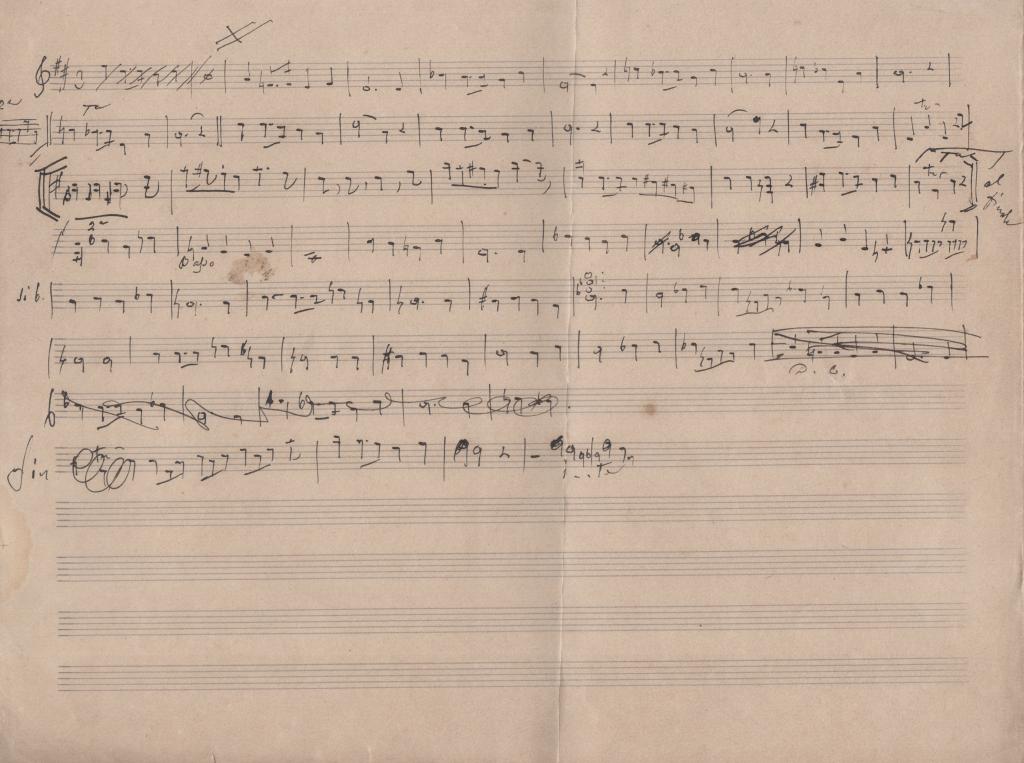 Spartito musicale su carta pentagrammata, interamente manoscritto (senza firma) di Lorenzo Perosi celebre sacerdote, compositore e direttore del Coro della Cappella Sistina dal 1898. Rinnovò la musica sacra con oratori e pagine corali divenute modello internazionale. Il foglio mostra una fitta stesura melodica con numerose correzioni d’autore, cancellature, riprese di battute e passaggi riscritti: elementi tipici di una bozza di lavoro. La pagina è divisa dalla consueta piega centrale da quaderno orchestrale; nella parte inferiore compaiono righi lasciati vuoti, a conferma del carattere di elaborazione in corso. Non sono presenti indicazioni di titolo. La scrittura musicale, richiama la grafia perosiana delle redazioni preparatorie: andamento sillabico-cantabile e linee che suggeriscono un impianto sacro-corale o per voci con accompagnamento. L’assenza di firma e datazione è coerente con i materiali di studio che Perosi produsse in grande quantità durante l’attività compositiva e direttoriale. I manoscritti musicali di Lorenzo Perosi sono altamente ricercati per la testimonianza diretta del processo creativo del più influente autore di musica sacra italiana tra Otto e Novecento. La presenza di correzioni e ripensamenti rende il pezzo particolarmente significativo per studiosi e collezionisti di autografi musicali.