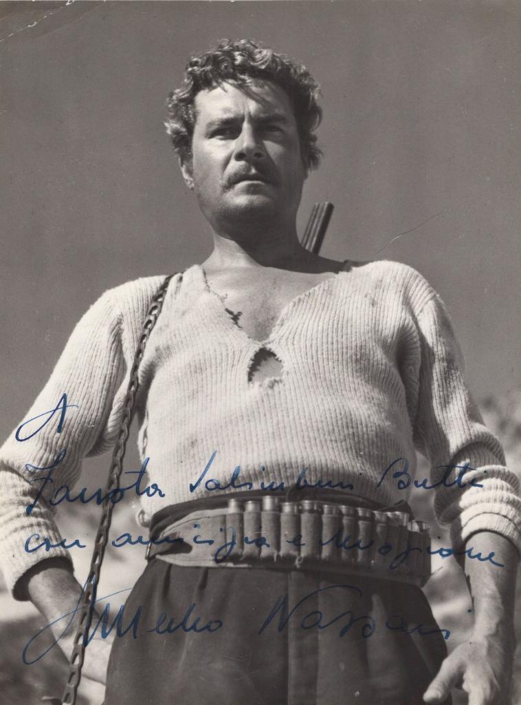 Splendida fotografia in bianco e nero con dedica interamente autografa e firmata di Amedeo Nazzari, fu uno dei volti più amati del cinema italiano, protagonista di oltre cento pellicole dagli anni ’30 ai ’70. Attore carismatico e simbolo dell’eroe virile, lavorò con registi come Alessandro Blasetti, Mario Camerini e Vittorio De Sica. L’immagine lo ritrae in una scena del film Il brigante Musolino (1950), diretto da Mario Camerini, in cui Nazzari interpretò il leggendario bandito calabrese Giuseppe Musolino. L’attore, con espressione intensa e maglia logorata, incarna perfettamente il carattere ribelle del personaggio, reso immortale dalla sua interpretazione. Dedica interamente autografa e firmata: "A Fausta Salimbeni Butti con amicizia e emozione Amedeo Nazzari".
