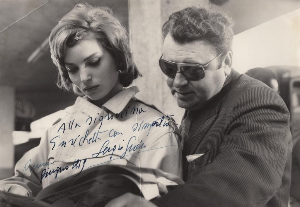 Fotografia originale in bianco e nero con dedica interamente autografa e firmata del regista Sergio Grieco noto regista e sceneggiatore italiano. Attivo dagli anni ’40 agli anni ’70, ha diretto numerosi film popolari, spaziando dal melodramma al peplum, fino alle spy-story e al poliziesco, diventando un protagonista del cinema di genere. Dedica interamente autografa e firmata indirizzata alla Signorina Enrichetti e datata Roma, giugno 1959. L’immagine ritrae Grieco accanto alla giovane attrice Elsa Martinelli in un momento intenso dietro alle quinte del film Ciao, ciao bambina! (Piove), del 1959. Elsa Martinelli fu un'attrice e modella di fama internazionale, interprete in Italia e a Hollywood, diva del cinema europeo degli anni ’50 e ’60 La fotografia riporta sul retro il timbro Foto di O. Civirani e alcuni difetti di un precedente distaccamento della stessa da un supporto cartaceo.