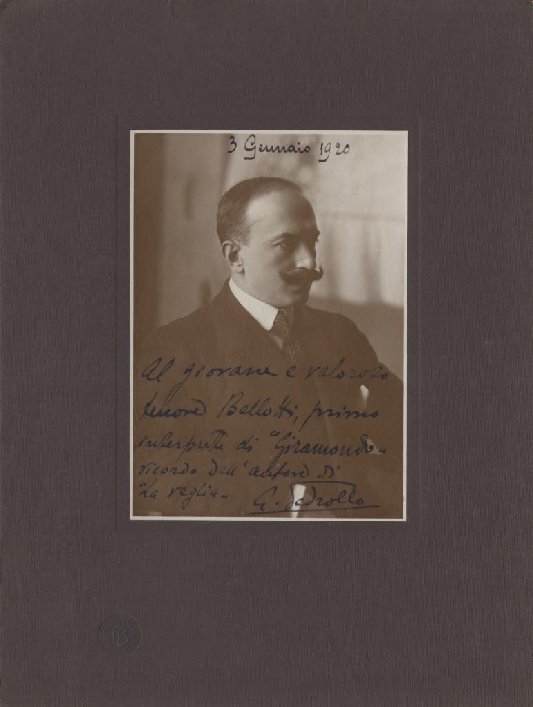 Elegante fotografia d’epoca applicata su passepartout, con dedica interamente autografa e firmata di Giuseppe Pedrollo celebre compositore e direttore d’orchestra. Autore di opere liriche e musica sinfonica, insegnò al Conservatorio di Verona, dove oggi porta il suo nome l’importante istituzione musicale cittadina. Lunga dedica indirizzata al giovane e valoroso tenore Bellotti, primo interprete dell’opera Giramondo, con la citazione della sua precedente composizione La veglia. La dedica, datata 3 gennaio 1920. Fotografia con timbro a secco Ballerini - Varese.