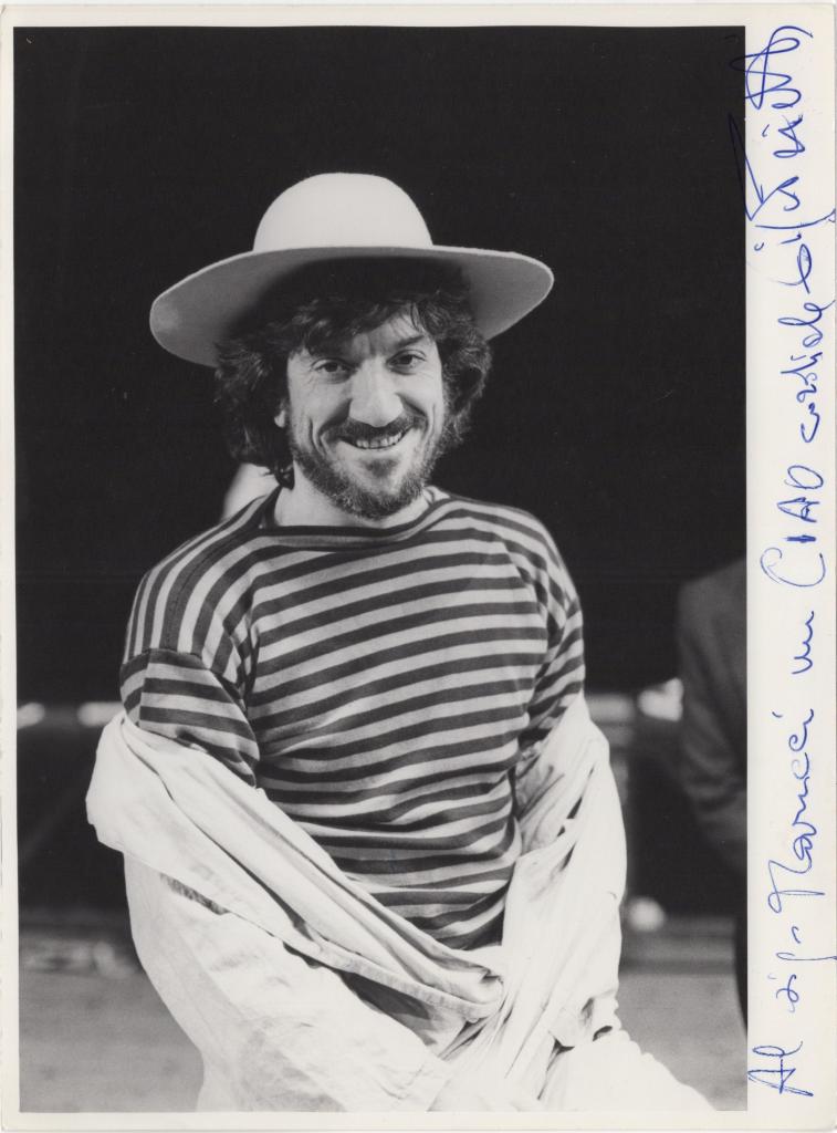 Bellissima fotografia in bianco e nero con dedica interamente autografa e firmata di Luigi "Gigi" Proietti celebre attore, regista, doppiatore e comico italiano. Considerato erede della tradizione del grande spettacolo romano, ha spaziato dal teatro classico alla televisione, imponendosi come icona culturale e popolare. L’immagine ritrae Proietti sorridente, con maglia a righe e cappello a larghe tese, in un momento che esprime appieno il suo carisma e la sua ironia. La dedica manoscritta a penna blu corre lungo il margine destro. Un raro ricordo personale di un artista che ha segnato la cultura popolare italiana con la sua versatilità e genialità.