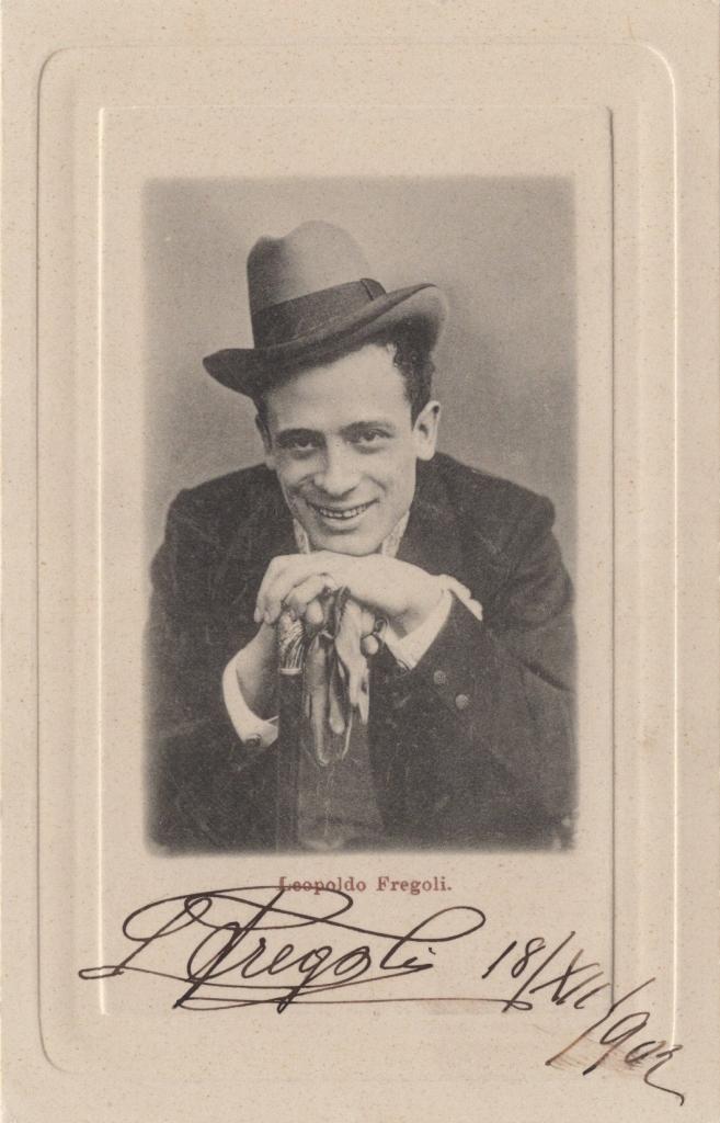 Cartolina fotografica con autografo di Leopoldo Fregoli celebre attore e trasformista celebre per la straordinaria rapidità nei cambi di costume e personaggio. Considerato un fenomeno teatrale unico, portò in scena spettacoli che univano recitazione, canto, mimo e imitazioni, diventando una leggenda del varietà e del teatro di fine Ottocento e inizio Novecento. Cartolina datata da Fregoli "18 dicembre 1903". L’immagine ritrae il celebre trasformista in un ritratto espressivo, con cappello inclinato e sorriso ironico, che richiama la sua arte camaleontica e innovativa.