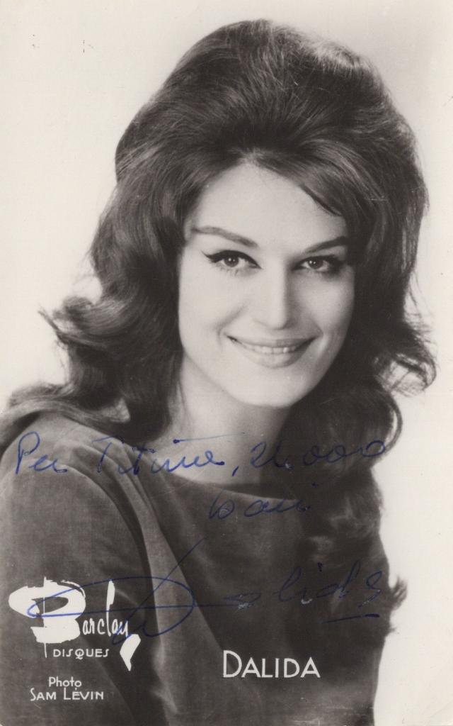 Fotografia promozionale in bianco e nero con autografo di Dalida, nome d’arte di Iolanda Cristina Gigliotti, celebre cantante e attrice di enorme successo, ha interpretato brani in diverse lingue, vendendo oltre 170 milioni di dischi in tutto il mondo. La sua voce e la sua figura sono rimaste simbolo di eleganza e malinconia nella cultura musicale internazionale. L’immagine, realizzata dal fotografo Sam Levin per l’etichetta Barclay, ritrae la cantante con il suo inconfondibile sorriso e l’eleganza che ne hanno fatto un’icona internazionale. Dedica interamente autografa e firmata molto speciale: "Per Titina 24000 baci Dalida". "24.000 baci” brano portato al successo da Adriano Celentano al Festival di Sanremo del 1961. Il pezzo, con il suo ritmo incalzante e lo spirito ribelle, fu considerato rivoluzionario per l’epoca, tanto da diventare un simbolo del rock’n’roll in Italia. Dalida, già affermata interprete a livello internazionale, comprese subito il potenziale della canzone e ne incise una versione francese che contribuì alla sua diffusione in Europa. Il brano, adattato al suo stile e alla sua vocalità intensa, le permise di avvicinare un pubblico giovane, entrando in sintonia con le nuove tendenze musicali degli anni ’60. La sua interpretazione, carica di energia e fascino, trasformò “24.000 baci” in un successo anche in Francia, rafforzando il suo ruolo di ponte culturale tra la musica italiana e quella francese.