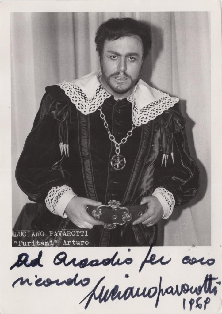 Bellissima fotografia in bianco e nero con autografo di Luciano Pavarotti, è stato uno dei più celebri tenori del Novecento. La sua voce limpida e potente, unita al carisma scenico, lo rese protagonista assoluto nei maggiori teatri d’opera del mondo. Conosciuto anche come “Big Luciano”, ha contribuito a portare la lirica a un pubblico vastissimo grazie a tournée internazionali, registrazioni e ai memorabili concerti dei Tre Tenori. L’immagine lo ritrae in abiti di scena nell’opera I Puritani di Vincenzo Bellini, nel ruolo di Arturo, uno dei più significativi della sua carriera giovanile. Dedica interamente autografa e firmata in calce: "(...) per caro ricordo Luciano Pavarotti 1969".