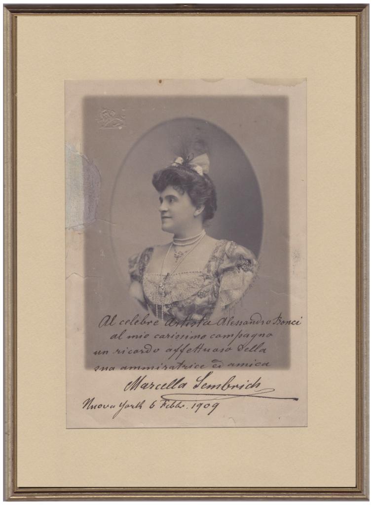 Rara fotografia in bianco e nero con dedica interamente autografa e firmata di Marcella Sembrich celebre soprano di fama mondiale, attiva nei maggiori teatri d’Europa e d’America, ricordata per il timbro cristallino e l’ampiezza del repertorio. La copiosa dedica è indirizzata al grande tenore ed artista Alessandro Bonci (1870–1940), tra i più acclamati interpreti italiani della sua epoca, ed è datata New York, 6 febbraio 1909. L’immagine ritrae la Sembrich con eleganza formale. Fotografia incorniciata con passepartout. Condizioni: presente un piccolo difetto a lato del ritratto che non compromette l'integrità dell'autografo.