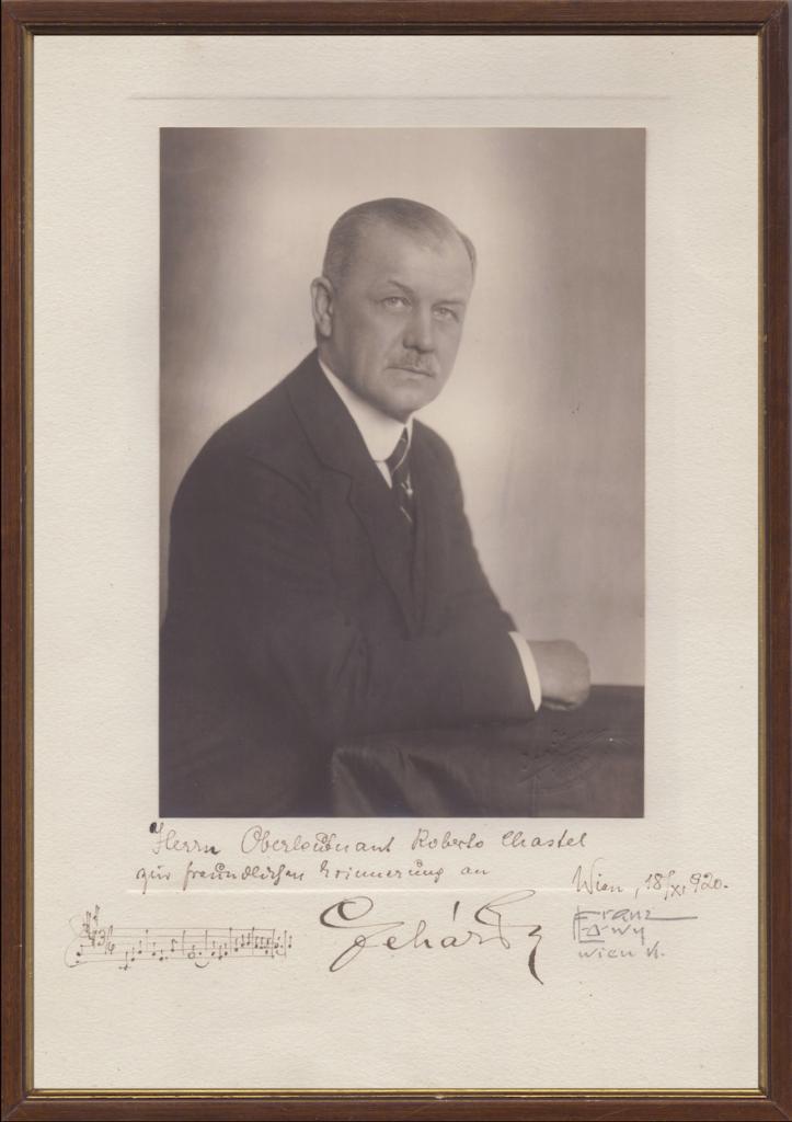 Bellissima fotografia d’epoca con dedica interamente autografa e firmata di Franz Lehár celebre compositore austriaco. La sua fama mondiale è legata a opere come La Vedova allegra, che lo consacrò come maestro assoluto del genere. La lunga dedica, arricchita da un rigo musicale autografo, è indirizzata a Roberto Chastel ed è stata redatta a Vienna il 18 novembre 1920. L’immagine ritrae Lehár in posa formale, mentre la presenza del frammento musicale manoscritto rende questo documento di straordinario interesse per collezionisti e appassionati di musica. Fotografia incorniciata con passepartout.
