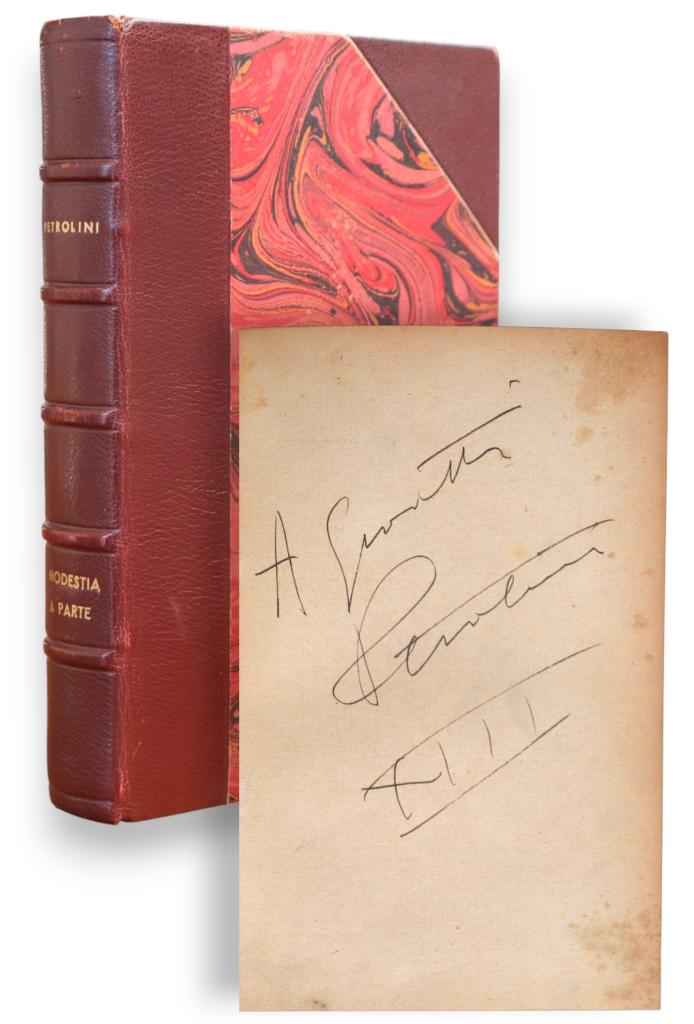 Esemplare della seconda edizione di Modestia a parte, autobiografia di Ettore Petrolini, pubblicata da Cappelli nel 1932. Il volume raccoglie ricordi, riflessioni e aneddoti dell’attore e drammaturgo romano, figura centrale della scena teatrale italiana del Novecento. L’esemplare è arricchito da una dedica interamente autografa e datata di Petrolini: "A Giovetti - Petrolini - XIII", vergata sull'occhiello. Il libro è stato successivamente rilegato con una bellissima rilegatura in mezza pelle e dorature sul dorso. Presente e ben conservata la copertina originale.