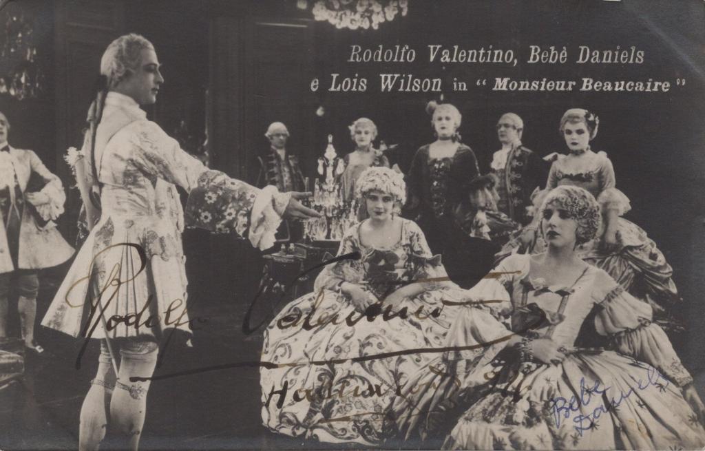 Rara cartolina ai sali d'argento con autografo di Rodolfo Valentino e Bebè Daniels che li ritrae nel film Monsieur Beaucaire (1924) Splendida cartolina fotografica d’epoca raffigurante una scena del film Monsieur Beaucaire (1924), con protagonisti Rodolfo Valentino, Bebè Daniels e Lois Wilson. L’immagine mostra Valentino in elegante costume settecentesco, accanto alle attrici in abiti di corte. Cartolina con autografo di Rodolfo Valentino celebre attore italiano, divenne una delle più grandi icone del cinema muto a Hollywood. Soprannominato “il Latin Lover”, conquistò il pubblico internazionale con film come The Sheik (1921) e Monsieur Beaucaire (1924). Morì prematuramente a soli 31 anni, lasciando un mito immortale. Presente anche l'autografo dell'attrice Bebè Daniels. L’autografo di Rodolfo Valentino è considerato uno dei più rari e ricercati del collezionismo cinematografico mondiale. La sua prematura scomparsa a soli 31 anni, nel 1926, limitò drasticamente la quantità di firme autentiche in circolazione. Per questo motivo, ogni documento da lui firmato rappresenta un cimelio di eccezionale importanza storica e collezionistica.