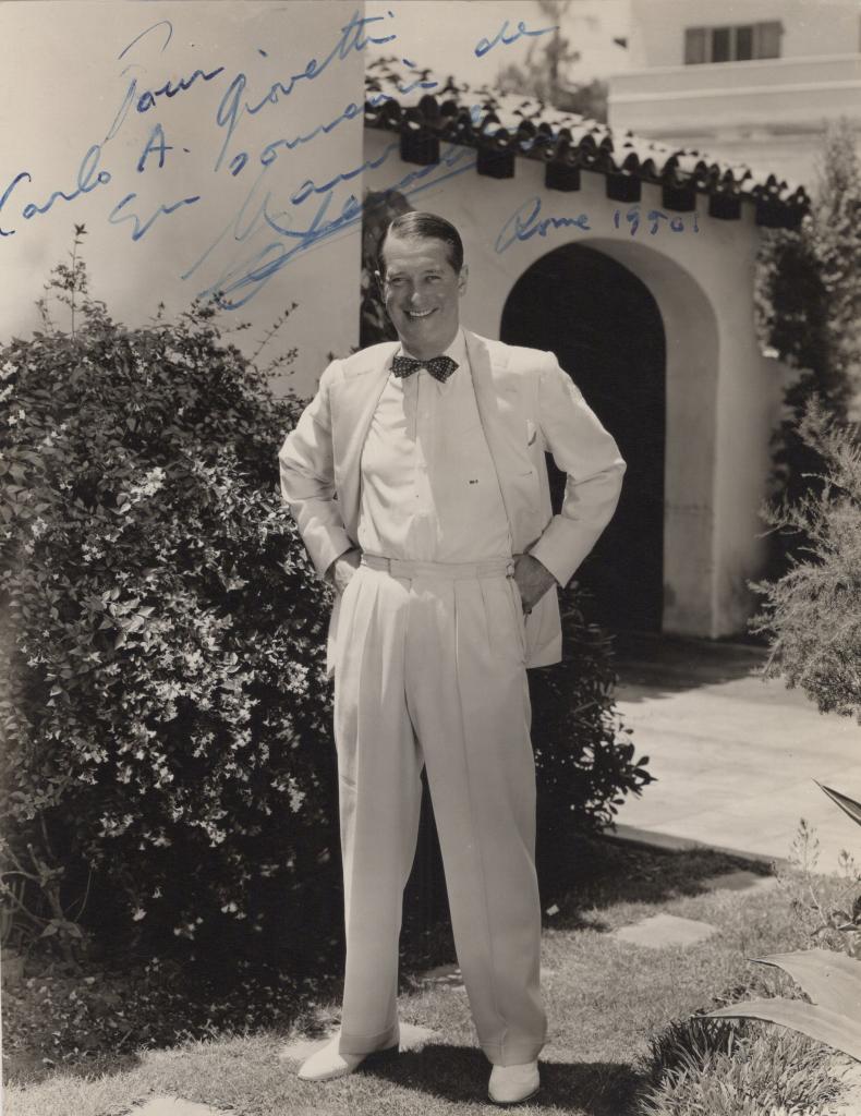 Fotografia con dedica interamente autografa e firmata di Maurice Chevalier celebre cantante e attore francese, icona dello stile parigino, conquistò Hollywood con musical come The Love Parade e Gigi. Voce inconfondibile e interprete di successi immortali, fu ambasciatore della cultura francese nel mondo. Dedica interamente autografa e firmata di Chevalier: "Pour Carlo A. Giovetti" datata Roma, 1950. Elegante fotografia in bianco e nero che ritrae Maurice Chevalier davanti alla sua casa a Beverly Hills.