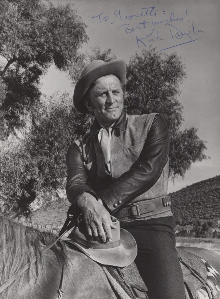 Fotografia con dedica interamente autografa e firmata di Kirk Douglas celebre attore, attivo per oltre sei decenni e protagonista in film come Spartacus (1960) e Paths of Glory (1957). Conosciuto per la sua intensità e la caratteristica fossetta sul mento, rimane una delle ultime icone dell’epoca d’oro di Hollywood. Splendida fotografia in bianco e nero raffigurante Kirk Douglas in abbigliamento da cowboy, seduto a cavallo con cappello e giacca in pelle. Douglas fu uno dei grandi protagonisti del cinema americano del Novecento e interpretò numerosi western di successo, genere che lo consacrò come volto carismatico e iconico. Tra i suoi titoli più celebri figurano Along the Great Divide (1951), The Big Sky (1952), Man Without a Star (1955), Gunfight at the O.K. Corral (1957) e Last Train from Gun Hill (1959). Dedica autografa e firmata in intestazione: "To Giovetti = Best whishes! Kirk Douglas ".