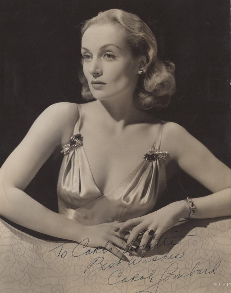 Elegante fotografia in bianco e nero raffigurante Carole Lombard, diva intramontabile di Hollywood, musa delle screwball comedies e tra le attrici più amate degli anni '30. L’immagine la ritrae in una posa raffinata, con abito da sera impreziosito da dettagli gioiello, ed è arricchita da una dedica autografa e firmata in calce. Carole Lombard fu protagonista in pellicole iconiche come My Man Godfrey (1936) e To Be or Not to Be (1942), diventando una delle interpreti più versatili e brillanti del suo tempo. La sua vita e carriera furono tragicamente interrotte a soli 33 anni da un incidente aereo nel 1942, mentre era impegnata in una tournée per la raccolta fondi a sostegno dello sforzo bellico.
