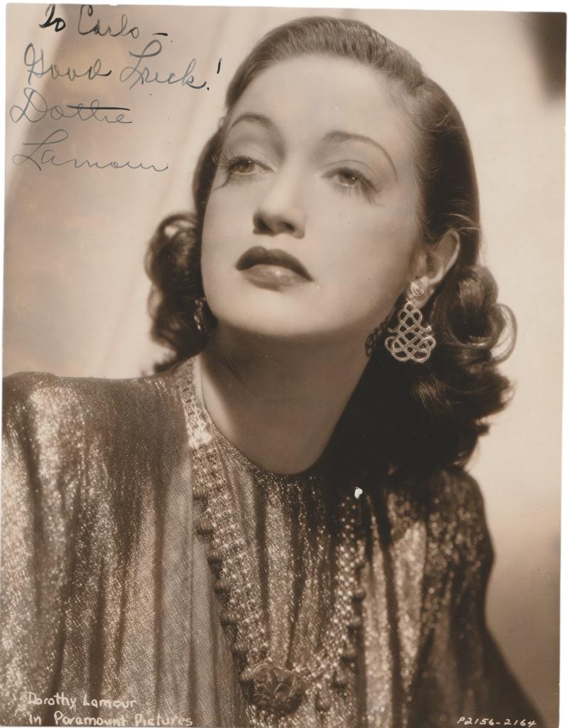 Elegante fotografia in bianco e nero di Dorothy Lamour, attrice e cantante statunitense celebre per i suoi ruoli nei film d’avventura e nelle commedie musicali degli anni ’30 e ’40, in particolare la fortunata serie Road to... accanto a Bing Crosby e Bob Hope. L’immagine, realizzata da Paramount Pictures, ritrae Lamour in primo piano con abito scintillante e gioielli, in un ritratto glamour tipico delle produzioni hollywoodiane dell’epoca. Presente una dedica interamente autografa e firmata in inchiostro nero: “To Carlo – Good Luck! Dorothy Lamour”.
