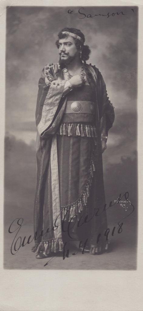 Straordinaria fotografia in bianco e nero con autografo di Enrico Caruso fu il più celebre tenore del suo tempo. Acclamato nei maggiori teatri d’opera d’Europa e d’America, legò il suo nome al Metropolitan di New York, dove fu protagonista per quasi vent’anni. Le sue registrazioni furono tra le prime a diffondere la voce lirica in tutto il mondo. L’immagine lo ritrae in abiti di scena nel ruolo di Samson nell’opera Samson et Dalila di Camille Saint-Saëns, uno dei suoi cavalli di battaglia. Caruso appare imponente e solenne, con il costume orientaleggiante che esalta la sua presenza scenica. Di suo pugno, il celebre tenore appone la firma, la data "11-4-1918" e la nota manoscritta in intestazione “Samson”. Fotografia rarissima e di eccezionale valore storico e collezionistico.