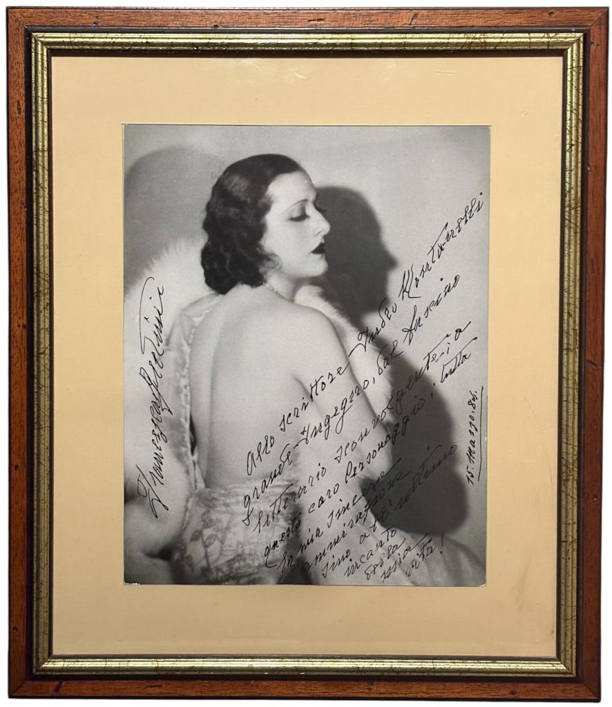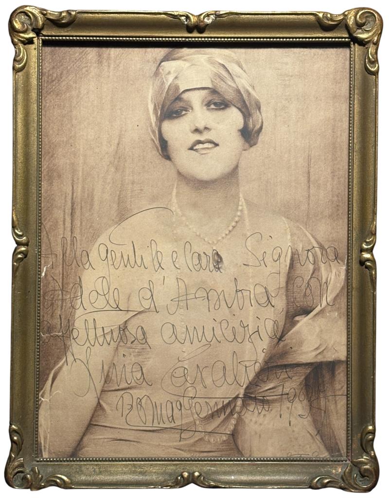 La dedica autografa è indirizzata alla Signora Adele d’Ambra, moglie dello scrittore e giornalista Lucio d’Ambra (pseudonimo di Luciano Attilio Luigi Ambrosini, 1874–1939), figura di spicco della vita culturale romana dei primi decenni del Novecento. La Cavalieri e la famiglia d’Ambra si conobbero negli ambienti mondani e artistici della capitale, condividendo amicizie comuni tra il teatro e la letteratura. Deliziosa cornice coeva.Dedica interamente autografa e firmata di Lina Cavalieri, celebre soprano e icona di bellezza del primo Novecento, universalmente conosciuta come “la donna più bella del mondo”. Dopo un’infanzia modesta, si impose rapidamente nei teatri d’Europa e d’America grazie al connubio di talento vocale e straordinaria eleganza. Acclamata interprete di Fedora, Manon Lescaut e La Bohème, fu anche icona di stile, musa di artisti e fotografi, tra cui il designer Piero Fornasetti, che ne immortalò il volto in una celebre serie di opere. La sua figura, sospesa tra arte e leggenda, rimane una delle più affascinanti della lirica e della cultura della Belle Époque.La dedica, vergata con inchiostro nero e dal tono personale, è indirizzata alla Signora Adele d’Ambra, moglie di Lucio, e recita: "Alla gentile e cara Signora Adele d'Ambra con affettuosa amicizia Lina Cavalieri - Roma 9 Gennaio 1937".L’immagine, una stampa fotografica tratta da un ritratto a matita, raffigura la Cavalieri in un’elegante posa, che esalta la grazia e il fascino per cui fu universalmente ammirata. Il volto delicato, l’acconciatura sofisticata e lo sguardo sognante rendono questa composizione di rara bellezza uno dei più suggestivi ritratti della Divina.